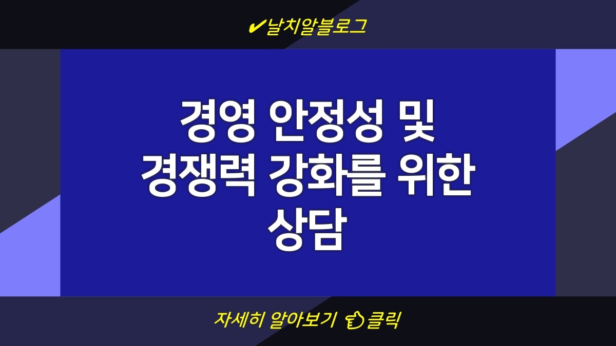 경영 안정성과 경쟁력 확보를 위한 상담 지원은 기업이 성공적인 경영 환경을 만들어 나가는 데 필수적인 요소입니다. 적절한 상담을 통해 기업은 문제를 조기에 인식하고, 최적의 해결책을 마련할 수 있으며, 지속 가능한 성장을 위한 기반을 다질 수 있습니다. 적극적인 상담 지원이 기업의 미래를 밝히는 데 큰 도움이 될 것입니다. 본 상담 지원에 대한 자세한 정보는 아래 링크를 통해 확인하실 수 있습니다. 상담 지원 신청 링크를 통해 쉽게 신청하세요.