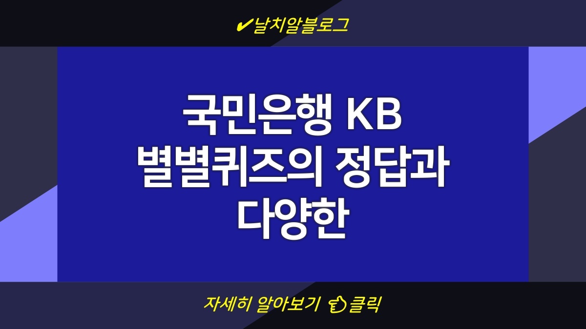 국민은행의 KB 별별퀴즈는 고객에게 다양한 맞춤형 혜택을 제공하는 특별한 이벤트입니다. 이 퀴즈는 금융 지식과 일반 상식을 바탕으로 하며, 참여자들은 참여를 통해 다양한 상품 및 서비스에 대한 정보를 얻을 수 있습니다. 퀴즈의 답변을 맞히면 소정의 경품이 제공되며, 고객은 이를 통해 금융에 대한 이해도를 높이고, 즐거운 경험을 할 수 있습니다. 혜택도 매우 다양하니 꼭 참여해 보시기 바랍니다.